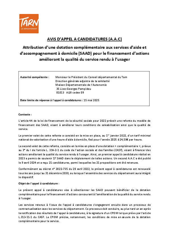 Le Conseil départemental du Tarn lance un appel à candidatures pour une dotation complémentaire destinée à financer des actions concrètes visant à améliorer la qualité des services rendus par les SAAD.