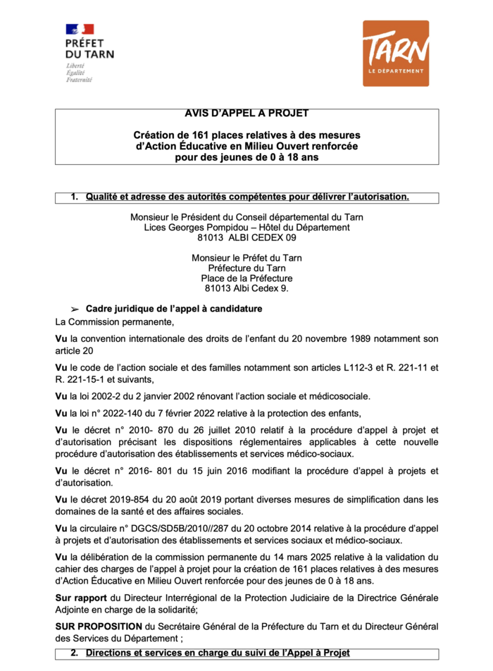 Le présent appel à projet vise la création de 161 places d’actions éducatives en Milieu Ouvert renforcées suite à l’arrêt de la cour de cassation du 02 octobre 2024.