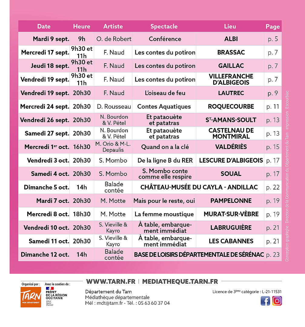 17 communes accueilleront une séance de contes. Le relais des bibliothèques du réseau départemental est incontournable pour faire vivre la culture au plus près de chaque tarnais. De même, les liens avec les publics des services départementaux : PMI-A, les Archives départementales, la Conservation des Musées et le service Sports et Jeunesse permettent aux différents publics de se rencontrer et de s’apprivoiser. Des séances pour les tout-petits aux balades contées en passant par des récits sur les problématiques actuelles, les spectacles raviront Petits et Grands.