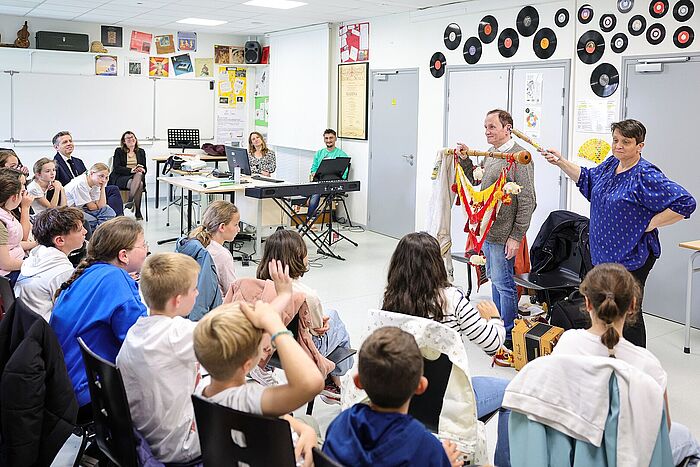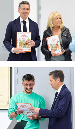 Aux côtés de Cathy Rabou, Conseillère départementale déléguée à la lecture publique, il a distribué cet ouvrage d’apprentissage accompagné d’une intervention en classe du groupe de musique occitane la Talvera.