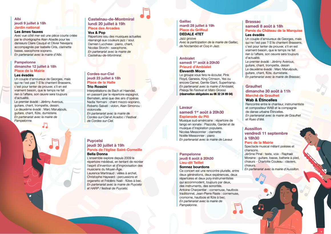 Pour vous offrir ces échappées musicales à partager en famille ou entre amis, le Département en partenariat avec l’Association Départementale pour le Développement des Arts du Tarn Adda du Tarn, le Conservatoire de danse et de musique du Tarn et les associations culturelles locales, a programmé 16 rendez-vous musicaux gratuits, répartis dans 13 communes.