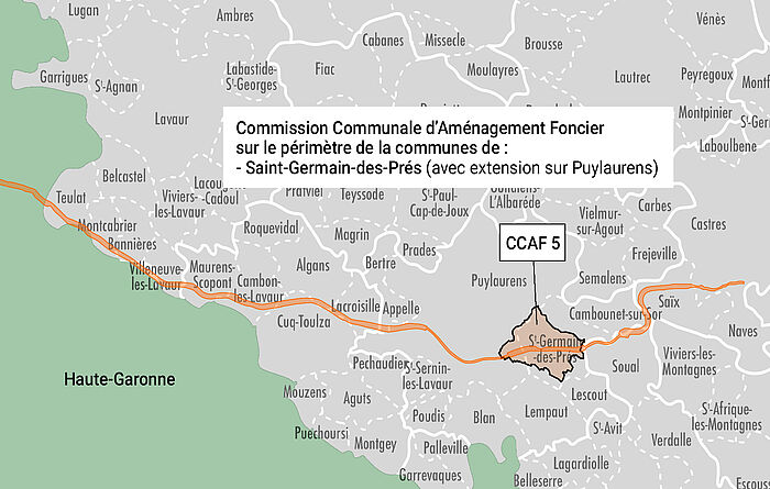 Dans le cadre de la procédure d’aménagement foncier liée au projet de liaison autoroutière entre Castres et Toulouse et suite aux décisions de la commission communale d’aménagement foncier de SAINT-GERMAIN-DES-PRES en dates des 05/02/2021 et 17/02/2022, le Président du Conseil départemental du Tarn a prescrit par arrêté départemental, en date du 1/06/2022, l’ouverture d’une enquête publique sur la proposition d’aménagement foncier rural de la C.C.A.F de SAINT-GERMAIN-DES-PRES : Proposition de mise en œuvre d’une opération d’Aménagement Foncier Agricole, Forestier et Environnemental (AFAFE) avec inclusion d’emprise du projet autoroutier A69 portant sur un périmètre de 1738 ha, dont 1582 ha sur la commune de SAINT-GERMAIN-DES-PRES, 33 ha en extension sur la commune de SOUAL et 4 ha en extension sur la commune de CAMBOUNET-SUR-LE-SOR.