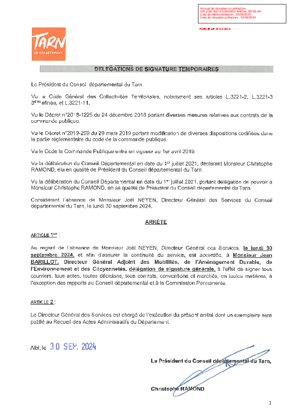 Arrêté de délégations de signature temporaires accordées à Mr Barillot pour le 30 septembre 2024